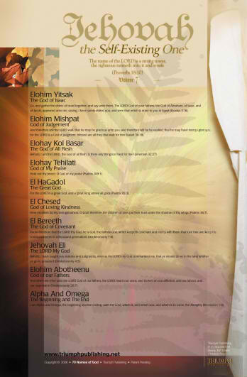 I AM; The God's power and might; the Lordship of God; the God's divine salvation; the Lord thy sanctifier; the Lord my shepherd; the Lord who is present; the Lord our healer; the Lord our righteousness; the Lord will provide; the Lord our banner; the Lord is peace; the Lord of Hosts; the God of Recompense; the most high God; the strong one who sees; the God of the mountains or God Almighty; the everlasting God; ELOHIM; ADONAI; JEHOVAH—YAHWEH; JEHOVAH-MACCADDESHEM; JEHOVAH-ROHI; 6. JEHOVAH-SHAMMAH; JEHOVAH-RAPHA; JEHOVAH-TSIDKENU; JEHOVAH-JIREH; JEHOVAH-NISSI; JEHOVAH-SHALOM; JEHOVAH-SABBAOTH; JEHOVAH-GMOLAH; EL-ELYON; EL-ROI; EL-SHADDAI; EL-OLAM; ABBA; ADVOCATE; ALMIGHTY; ALPHA; ANCIENT OF DAYS; ANOINTED ONE; APOSTLE; ARM OF THE LORD; AUTHOR OF LIFE; AUTHOR OF OUR FAITH; BEGINNING; BLESSED & HOLY RULER; BRANCH; BREAD OF GOD; BREAD OF LIFE; BRIDEGROOM; BRIGHT MORNINGSTAR; CHIEF SHEPHERD; CHOSEN ONE; CHRIST; CHRIST OF GOD; CHRIST THE LORD; CHRIST, SON OF LIVING GOD; COMFORTER; COMMANDER; CONSOLATION OF ISRAEL; CONSUMING FIRE; CORNERSTONE; COUNSELOR; CREATOR; DELIVERER; DESIRED OF ALL NATIONS; DOOR; END; ETERNAL GOD; EVERLASTING FATHER; FAITHFUL & TRUE; FAITHFUL WITNESS; FATHER; FIRSTBORN; FIRST FRUITS; FOUNDATION; FRIEND OF TAX COLLECTORS & SINNERS; GENTLE WHISPER; GIFT OF GOD; GLORY OF THE LORD; GOD; GOD ALMIGHTY; GOD OVER ALL; GOD WHO SEES ME; GOOD SHEPHERD; GREAT HIGH PRIEST; GREAT SHEPHERD; GUIDE; HEAD OF THE BODY; HEAD OF THE CHURCH; HEIR OF ALL THINGS; HIGH PRIEST; HIGH PRIEST FOREVER; HOLY ONE; HOLY ONE OF ISRAEL; HOLY SPIRIT; HOPE; HORN OF SALVATION; IMAGE OF GOD; IMAGE OF HIS PERSON; IMMANUEL; JEALOUS; JEHOVAH; JESUS; JESUS CHRIST OUR LORD; JUDGE; KING; KING ETERNAL; KING OF KINGS; KING OF THE AGES; LAMB OF GOD; LAST ADAM; LAWGIVER; LEADER; LIFE; LIGHT OF THE WORLD; LIKE AN EAGLE; LILY OF THE VALLEYS; LION OF THE TRIBE OF JUDAH; LIVING STONE; LIVING WATER; LORD; LORD GOD ALMIGHTY; LORD JESUS CHRIST; LORD OF ALL; LORD OF GLORY; LORD OF HOSTS; LORD OF LORDS; LORD OUR RIGHTEOUSNESS; LOVE; MAN OF SORROWS; MASTER; MEDIATOR; MERCIFUL GOD; MESSENGER OF THE COVENANT; MESSIAH; MIGHTY GOD; MIGHTY ONE; NAZARENE; OFFSPRING OF DAVID; OMEGA; ONLY BEGOTTEN SON; OUR PASSOVER LAMB; OUR PEACE; POTTER; POWER OF GOD; PRINCE OF PEACE; PROPHET; PURIFIER; RABBONI (TEACHER); RADIANCE OF GOD'S GLORY; REDEEMER; REFINER'S FIRE; RESURRECTION; RIGHTEOUS ONE; ROCK; ROOT OF DAVID; ROSE OF SHARON; RULER OF GOD'S CREATION; RULER OVER KINGS OF EARTH; RULER OVER ISRAEL; SAVIOR; SCEPTER OUT OF ISRAEL; SEED; SERVANT; SHEPHERD OF OUR SOULS; SHIELD; SON OF DAVID; SON OF GOD; SON OF MAN; SON OF THE MOST HIGH; SOURCE; SPIRIT OF GOD; STAR OUT OF JACOB; STONE; SUN OF RIGHTEOUSNESS; TEACHER; TRUE LIGHT; TRUE WITNESS; TRUTH; VINE; WAY; WISDOM OF GOD; WITNESS; WONDERFUL; WORD; WORD OF GOD; AMEN.
